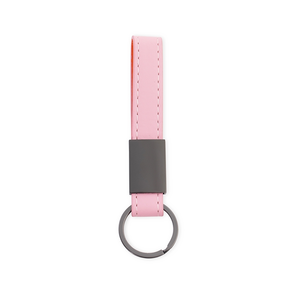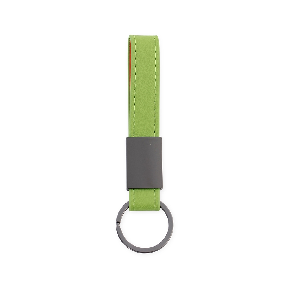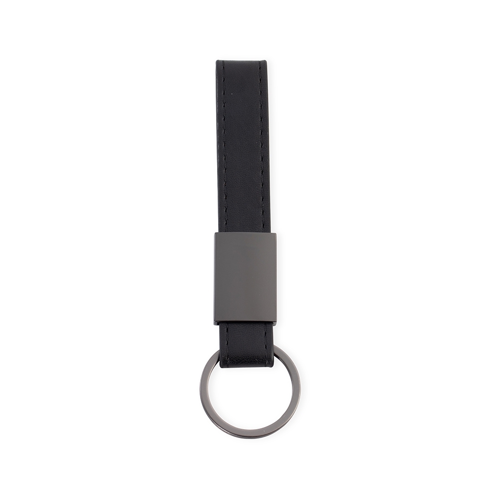 Chaveiro metálico com tira em couro sintético. Possui superfície lisa e dois parafusos na parte posterior.